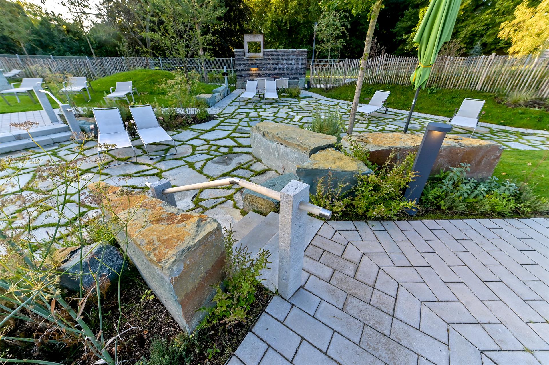 Die neu gestalteten Freianlagen vermitteln den Badegästen das Gefühl, sich in einer ungewöhnlichen, geborgenen und einmaligen Umgebung zu befinden, die sie den Alltag vergessen lässt. Dazu tragen zum einen Mauern und Fels aus Grünsandstein bzw. Ziegelmauerwerk, zum anderen aber auch die vielen Bäume und Gehölze bei: Hier bildet ein Kiefernhain eine Baumhalle, dort gliedern Feldahorn, einzelne Kirschbäume, Schirmform-Felsenbirnen und Weißdorn die Anlage. Breitkronige, teils mehrstämmige Großgehölze schaffen auch Sichtschutz von oben.
