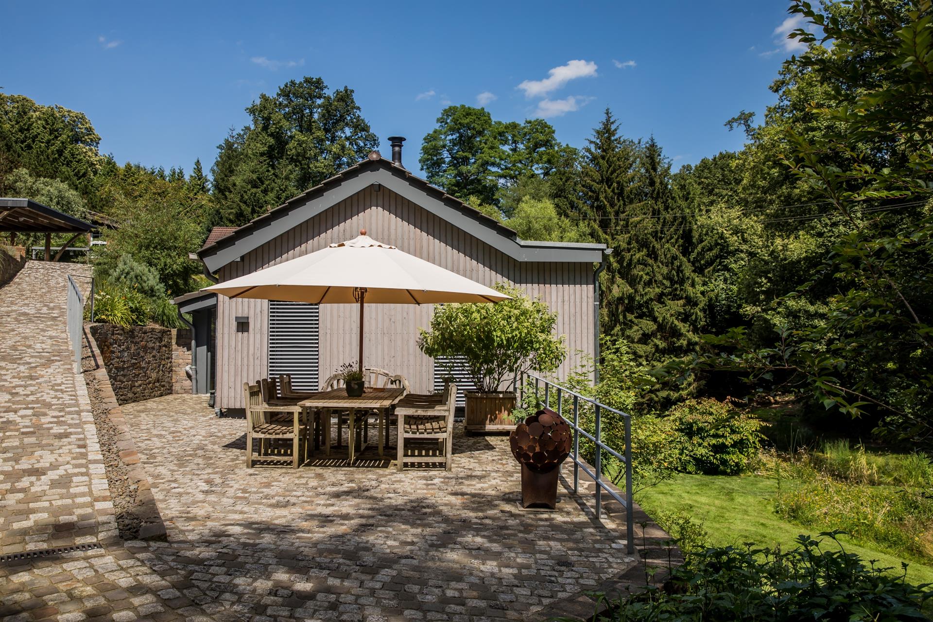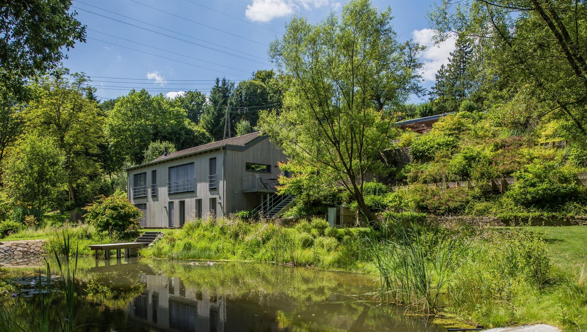 In einem weiteren Bauabschnitt standen die Teiche im Mittelpunkt. Die Teichsanierung brachte dabei nicht nur eine optische Aufwertung, sondern war zugleich ein zentraler Baustein des Regenwassermanagements: Das Erdgeschoss des Hauses liegt fast auf Höhe der Teiche. Bei Starkregen schwillt der kleine Bach an und die Teiche drohen überzutreten, da von den Hängen extrem viel Wasser in und durch das Tal fließt. Vor diesem Hintergrund modellierten die Landschaftsexperten das Gelände teilweise neu, prüften Fließrichtungen und sorgten für eine professionelle Entwässerung. Die Wasserflächen der Teiche wurden verkleinert, die brüchigen Deiche erneuert sowie moderne Ablauf- und Stauvorrichtungen, sogenannte Mönche, installiert.