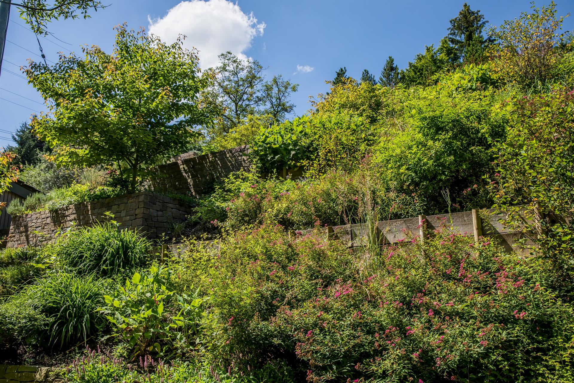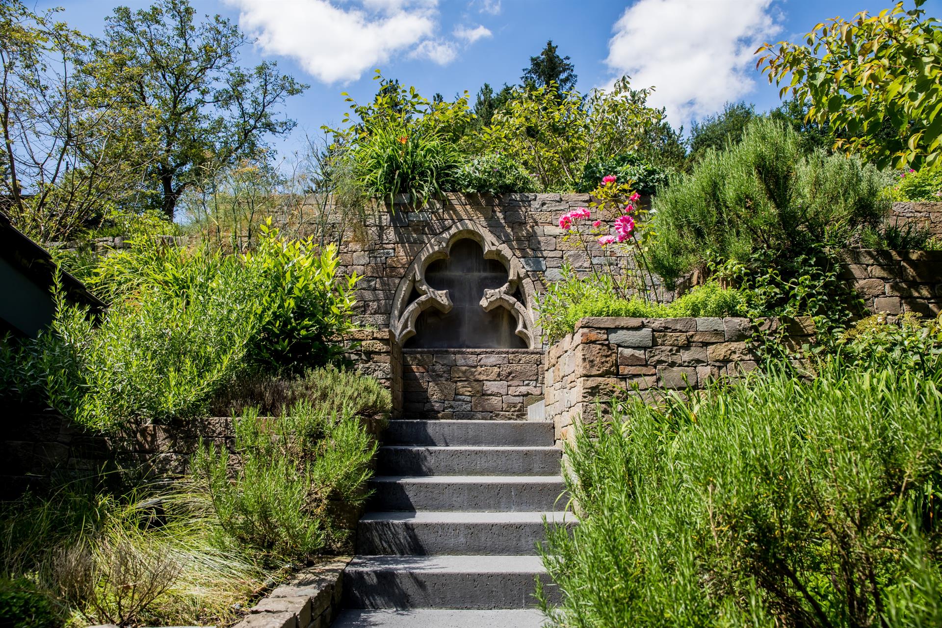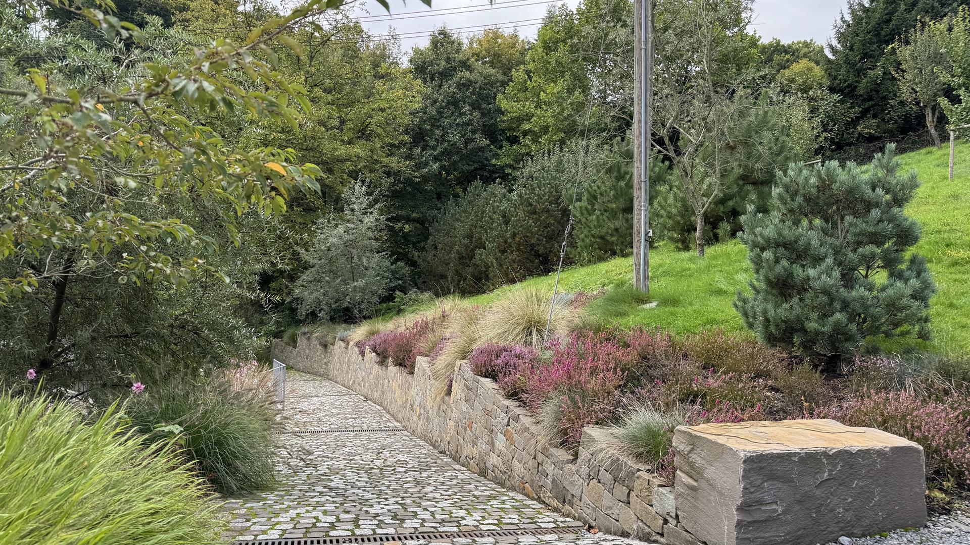 Besondere Aufmerksamkeit erhielt auch die seitlich am Haus gelegene Terrasse. Von einem höher gelegenen Platz mit Carport legten die Landschaftsgärtner einen Weg dorthin, eingefasst von Trockenmauern, die in bergischer Grauwacke ausgeführt sind. Mit dem regionalen Naturstein, der aus einem Steinbruch im nahen Lindlar stammt, arbeitet der Fachbetrieb bevorzugt. Das Besondere an den Mauern: Jeder einzelne Stein wurde von Hand nachbearbeitet, um ein harmonisches Gesamtbild zu erzeugen. Ein einzigartiger Fund inspirierte zusätzlich: Die Landschaftsgärtner ließen ein altes Kirchenfenster, das auf dem Grundstück entdeckt wurde, von einem Steinmetz restaurieren und integrierten es kunstvoll in eine der Natursteinmauern.