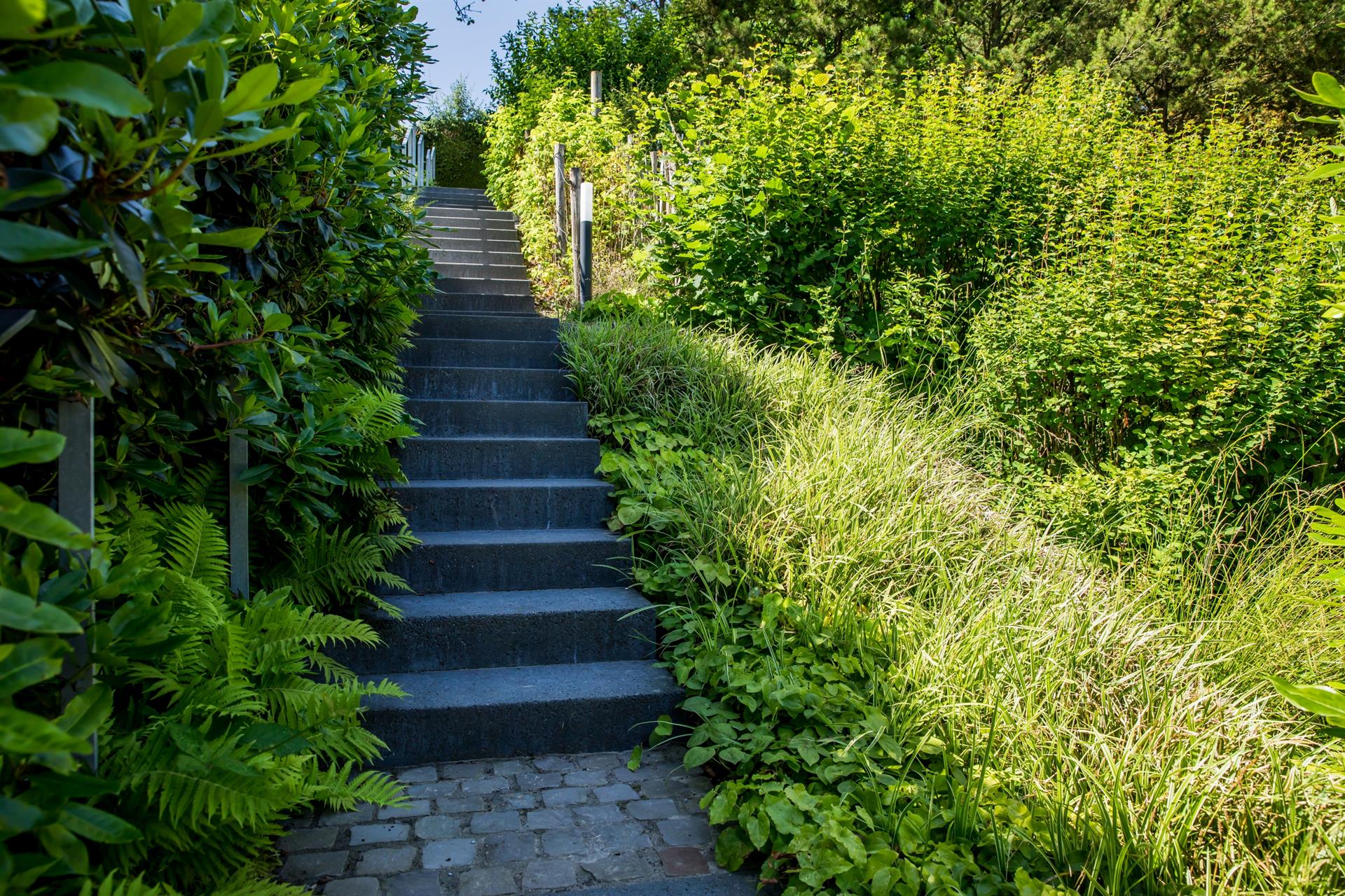 Technik von heute ist in diesem Garten natürlich auch zu finden – so weit wie möglich unsichtbar integriert: Ein Mähroboter pflegt vor allem den neu verlegten Rasen zwischen Naturteichen und Haus, der in diesem Garten Wegefunktion hat. Darüber hinaus darf der Rasen vielfach frei wachsen. Automatische Bewässerungssysteme für die Beete werden teilweise aus einer Zisterne gespeist. Sämtliche Systeme sind per Internet steuerbar.